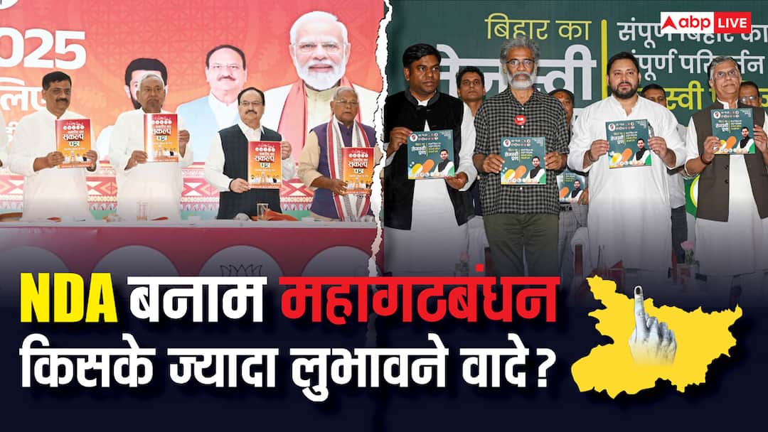 बिहार विधानसभा चुनाव 2025 के लिए सत्तारूढ़ गठबंधन दल NDA और विपक्षी महागठबंधन… दोनों के ही घोषणा पत्र रिलीज हो गए हैं. बिहार की जनता के लिए सत्ता और विपक्ष ने वादों की झड़ी लगा दी है. अब जनता यह जानना चाहती है कि दोनों दलों में से किसने वोटर्स से ज्यादा लुभावने वादे किए हैं.