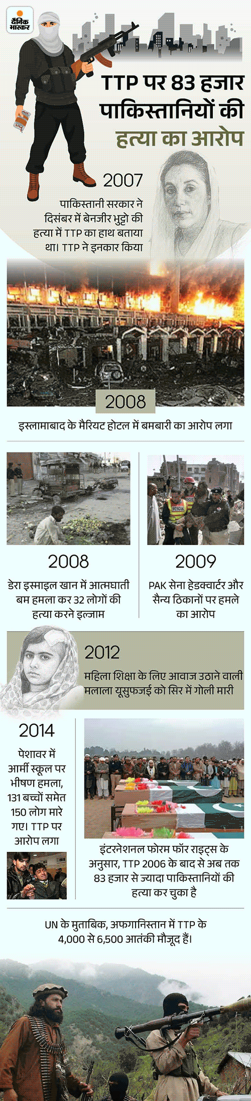 - 2007 में बेतुल्लाह मेहसूद ने 13 विद्रोही गुटों को मिलाकर तहरीक-ए-तालिबान पाकिस्तान (TTP) बनाया।