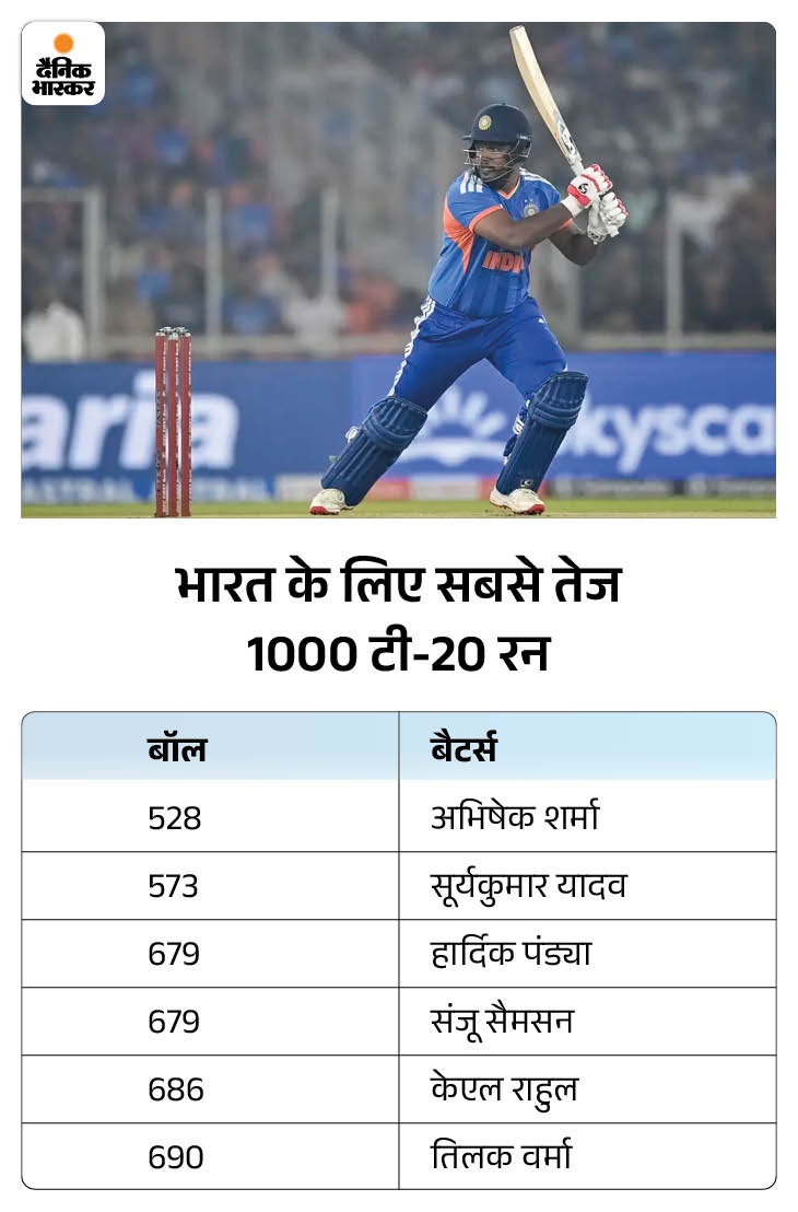 संजू सैमसन ने 679 गेंदों में 1000 टी-20 इंटरनेशनल रन पूरे कर लिए। इसके साथ ही उन्होंने भारत के लिए गेंदों के हिसाब से सबसे तेज एक हजार रन बनाने के मामले में हार्दिक पंड्या की बराबरी कर ली। वहीं इस सूची में अभिषेक शर्मा टॉप पर हैं, जिन्होंने महज 528 गेंदों में 1000 टी-20 रन का आंकड़ा छुआ है।