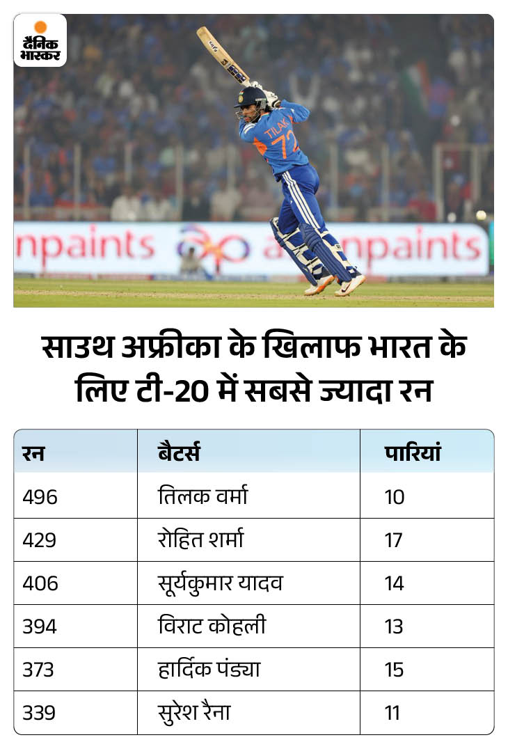 तिलक वर्मा ने साउथ अफ्रीका के खिलाफ टी-20 इंटरनेशनल में रोहित शर्मा का रिकॉर्ड तोड़ दिया। उन्होंने महज 10 पारियों में 496 रन बनाकर इस लिस्ट में पहला स्थान हासिल कर लिया। इससे पहले यह रिकॉर्ड रोहित शर्मा के नाम था, जिन्होंने 17 पारियों में 429 रन बनाए थे। इस मामले में विराट कोहली और सूर्यकुमार यादव भी तिलक वर्मा से पीछे रह गए।