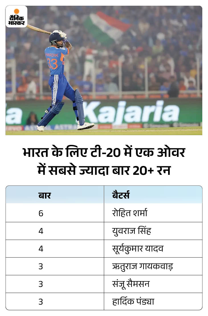 हार्दिक पंड्या ने भारत के लिए तीसरी बार किसी एक ओवर में 20 से ज्यादा रन बनाए। इस उपलब्धि के साथ वह उन चुनिंदा बल्लेबाजों की सूची में शामिल हैं, जिन्होंने टी-20 इंटरनेशनल में एक ओवर में 20+ रन बनाए हैं। इस मामले में रोहित शर्मा सबसे आगे हैं, जिन्होंने यह कारनामा 6 बार किया है, जबकि युवराज सिंह और सूर्यकुमार यादव 4-4 बार एक ओवर में 20 से ज्यादा रन बना चुके हैं।
