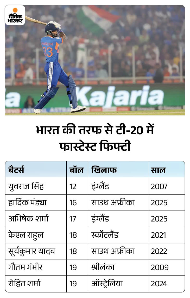 हार्दिक पंड्या ने मात्र 16 गेंदों में अर्धशतक जड़कर भारत के लिए टी-20 इंटरनेशनल में दूसरी सबसे तेज हाफ सेंचुरी लगा दी। इस मामले में उनसे आगे सिर्फ युवराज सिंह हैं, जिनके नाम सबसे तेज फिफ्टी का रिकॉर्ड है। युवराज ने 2007 टी-20 वर्ल्ड कप में इंग्लैंड के खिलाफ महज 12 गेंदों में अर्धशतक पूरा किया था। इसी ऐतिहासिक मैच में युवराज सिंह ने स्टुअर्ट ब्रॉड के एक ओवर में छह छक्के भी लगाए थे।