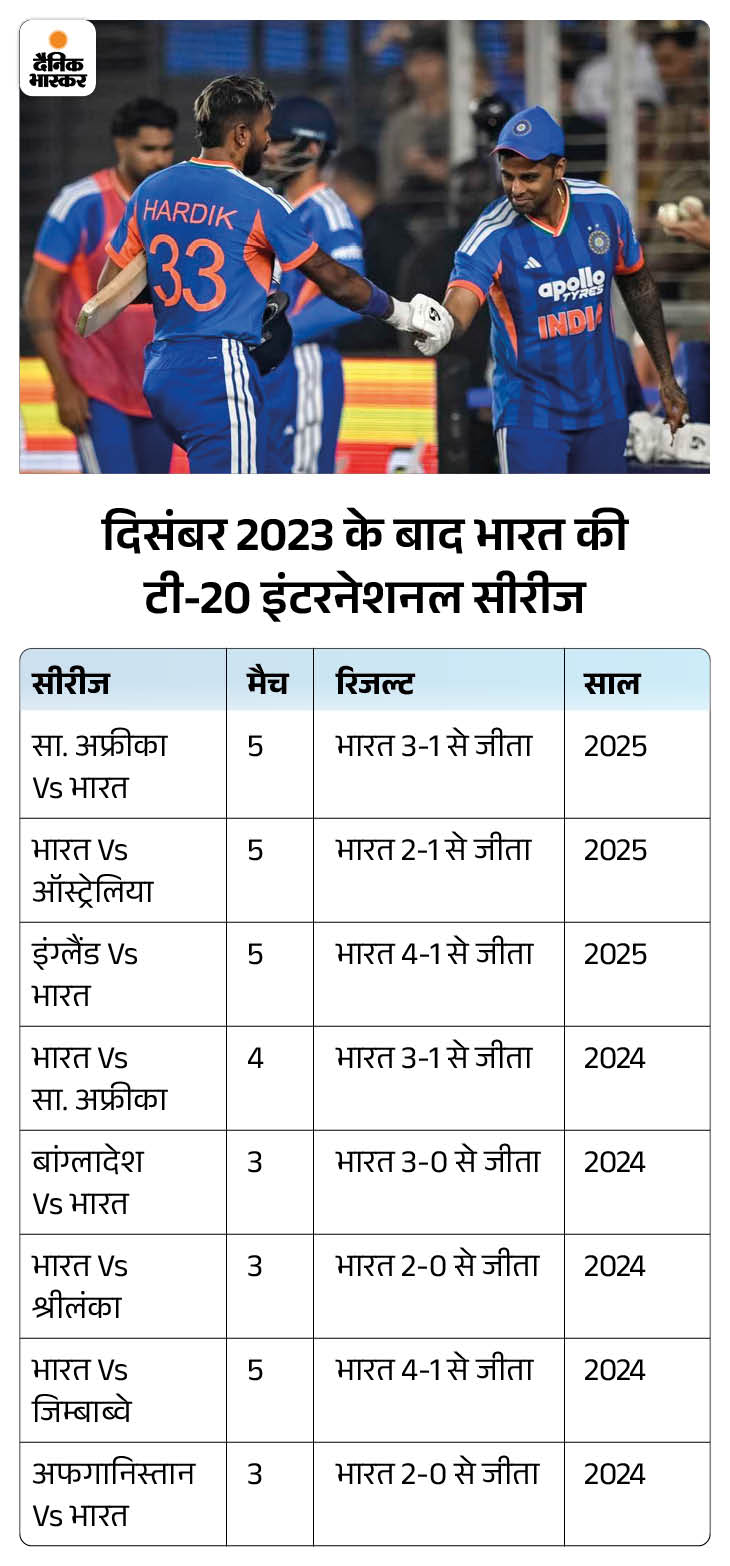 भारत ने टी-20 इंटरनेशनल क्रिकेट में लगातार आठवीं सीरीज जीतकर अपना दबदबा कायम रखा है। दिसंबर 2023 में भारत ने साउथ अफ्रीका 1-1 से सीरीज बराबरी की थी। इसके बाद से भारत ने सभी सीरीज अपने नाम की है।