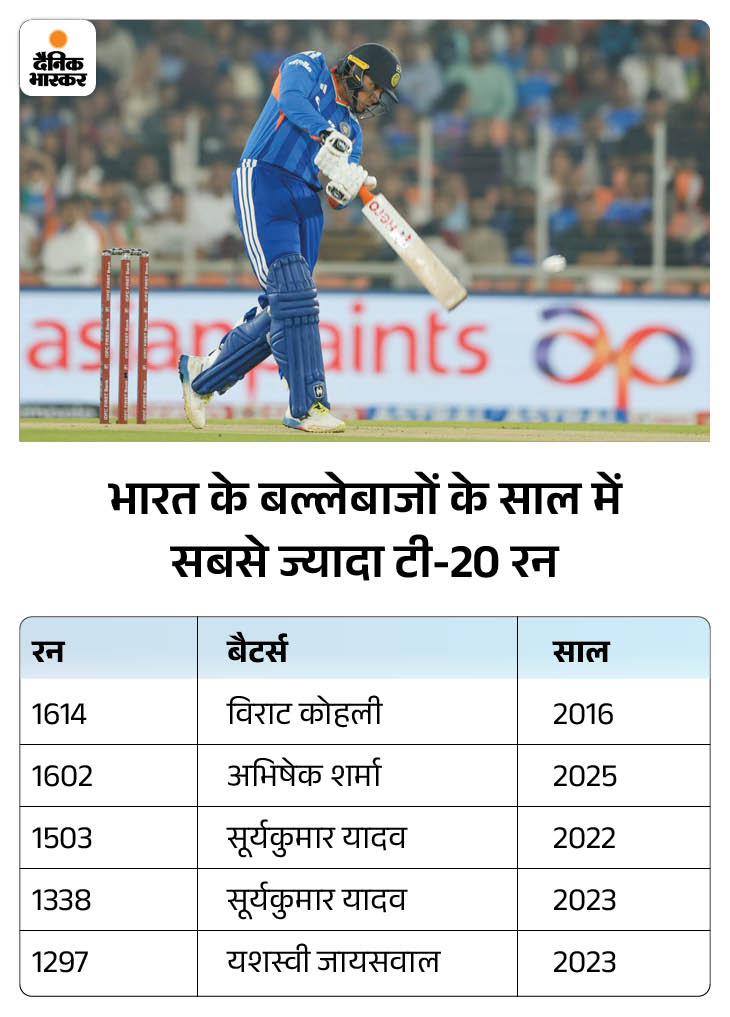 अभिषेक शर्मा भारत के लिए एक साल में सबसे ज्यादा टी-20 रन बनाने वाले दूसरे खिलाड़ी बन गए। उन्होंने इस साल 1602 रन बनाए। अभिषेक विराट कोहली के 2016 के ऐतिहासिक रिकॉर्ड से महज 13 रन दूर रह गए। कोहली ने उस साल 1614 रन बनाए थे, जो अब भी किसी भारतीय बल्लेबाज द्वारा एक साल में बनाए गए सबसे ज्यादा टी-20 रन का रिकॉर्ड है।