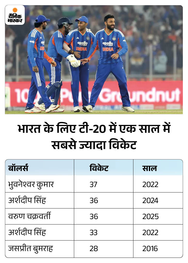 साल 2025 में वरुण चक्रवर्ती ने टी-20 इंटरनेशनल क्रिकेट में शानदार प्रदर्शन करते हुए 36 विकेट अपने नाम किए। इसके साथ ही उन्होंने भारत के लिए एक साल में सबसे ज्यादा विकेट लेने के मामले में अर्शदीप सिंह के बराबरी पर पहुंच गए हैं। वे भुवनेश्वर कुमार के 2022 में बनाए गए 37 विकेट के रिकॉर्ड से एक विकेट दूर रह गए।