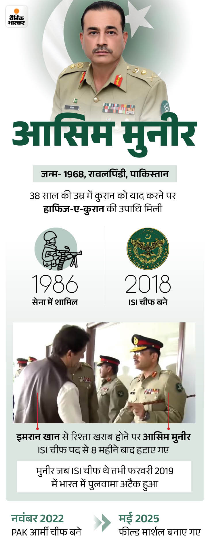 इससे पहले ऑपरेशन सिंदूर के बाद इस साल 20 मई को पाकिस्तानी सरकार ने आसिम मुनीर को फील्ड मार्शल का दर्जा दिया था।