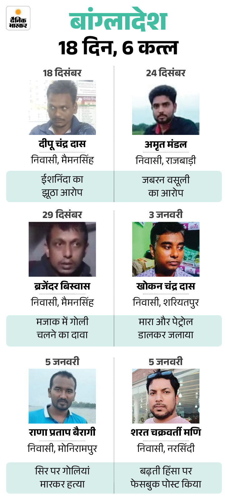 5 जनवरी को ही जेसोर जिले में भी एक हिंदू व्यक्ति की गोली मारकर हत्या कर दी गई थी। मोनिरामपुर इलाके में एक आइस फैक्ट्री मालिक राणा प्रताप बैरागी की सार्वजनिक रूप से हत्या हुई।