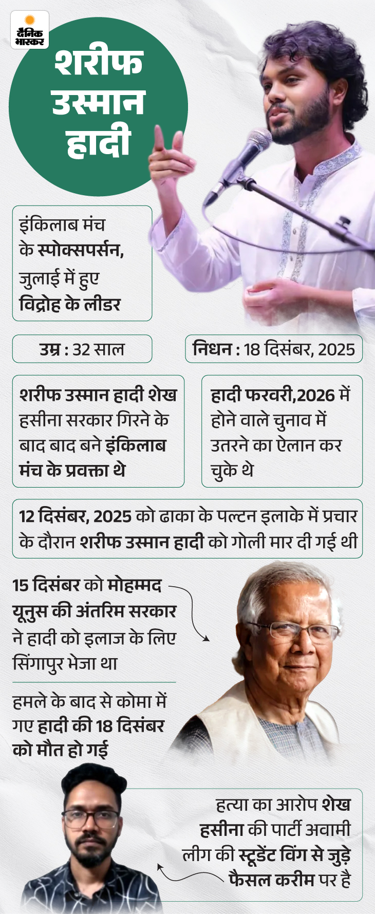 उस्मान हादी अगस्त 2024 में शेख हसीना सरकार के विरोध में हुए छात्र आंदोलन के लीडर थे। वे शेख हसीना और भारत विरोधी माने जाते थे। 12 दिसंबर को उन्हें चुनाव प्रचार के दौरान गोली मार दी गई थी। यूनुस सरकार ने उन्हें इलाज के लिए सिंगापुर भेजा था, लेकिन 18 दिसंबर को हादी की मौत हो गई।