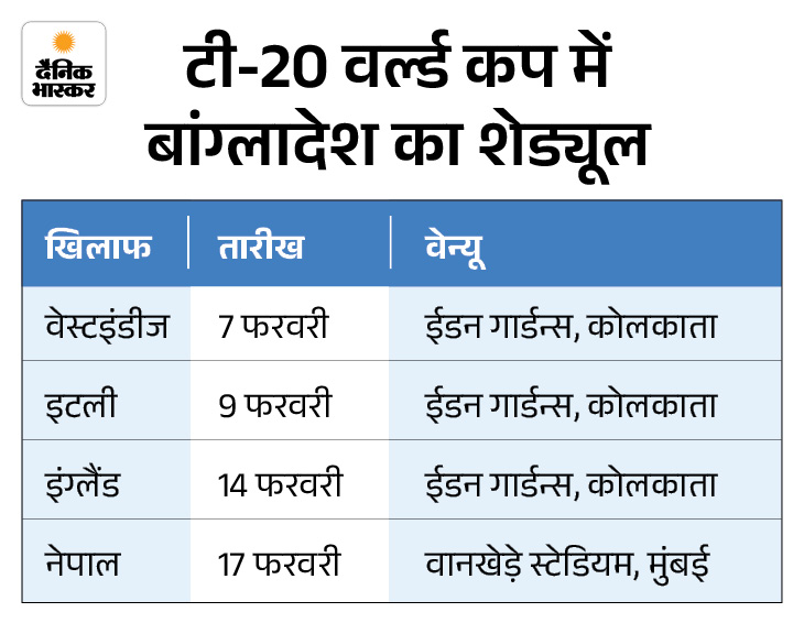 टी-20 वर्ल्ड कप 7 फरवरी से भारत और श्रीलंका में खेला जाना है। बांग्लादेश को ग्रुप स्टेज के अपने सभी चार मुकाबले भारत में ही खेलने हैं। तीन मैच कोलकाता के ईडन गार्डन्स मैदान पर और एक मैच मुंबई के वानखेड़े स्टेडियम में है।
