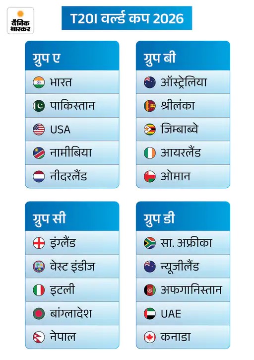बांग्लादेश का ग्रुप मुश्किल टी-20 वर्ल्ड कप 2026 के ग्रुप स्टेज में कुल 20 टीमें शामिल हैं, जिन्हें 4 अलग-अलग ग्रुप में बांटा गया। हर टीम अपने ग्रुप में 4 लीग मुकाबले खेलेगी। लीग स्टेज के बाद हर ग्रुप से 2-2 टॉप टीमों को सुपर-8 स्टेज में एंट्री मिलेगी। ग्रुप-सी की बांग्लादेश और ग्रुप-डी की अफगानिस्तान का ग्रुप सबसे मुश्किल नजर आ रहा हैं, क्योंकि इनमें इंग्लैंड, वेस्टइंडीज, साउथ अफ्रीका और न्यूजीलैंड शामिल हैं। चारों टीमों को फाइनल खेलने का अनुभव है, वहीं बांग्लादेश और अफगानिस्तान कभी किसी वर्ल्ड कप के फाइनल में नहीं पहुंच सकीं।