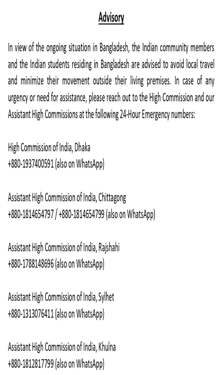 बांग्लादेश में भारतीय उच्चायोग ने शुक्रवार सुबह नोटिस जारी कर बांग्लादेश में रहने वाले भारतीय समुदाय के सदस्यों और भारतीय छात्रों से यात्रा से बचने की अपील की है।
