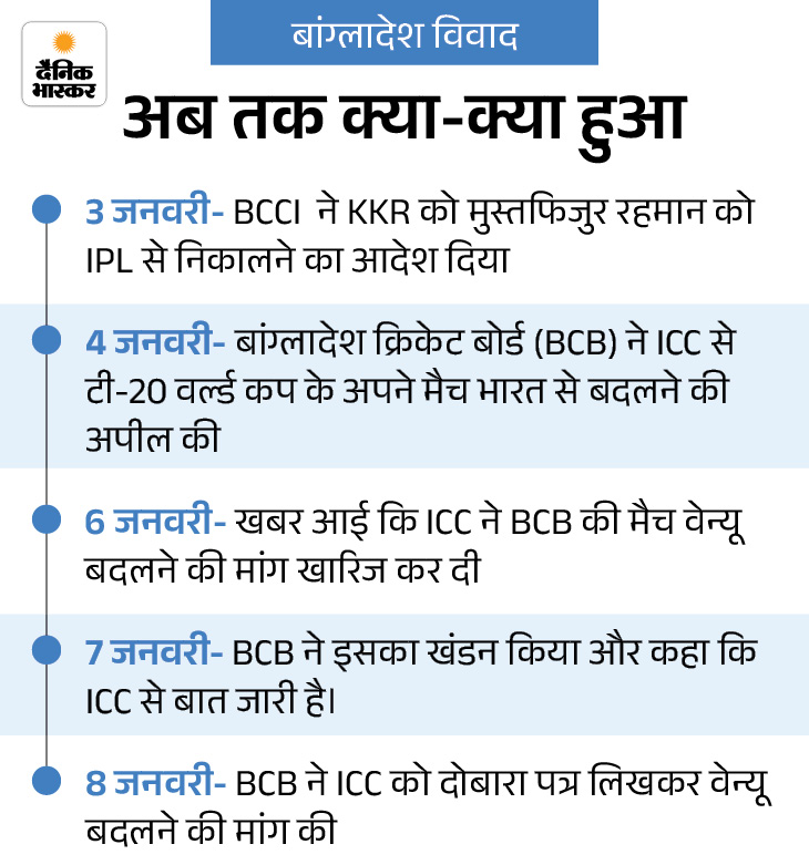 KKR से मुस्तफिजुर को रिलीज किए जाने के बाद बांग्लादेश क्रिकेट बोर्ड और वहां की सरकार ने IPL के प्रसारण पर बैन लगा दिया। साथ ही भारत में वर्ल्ड कप मैच खेलने से भी इनकार कर दिया और ICC को वेन्यू बदलने के लिए ई-मेल भेजा था।