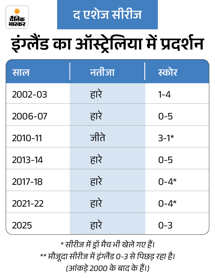 इंग्लैंड पिछले 18 मैच से ऑस्ट्रेलिया में एक भी टेस्ट मैच नहीं जीत पाया है। ऑस्ट्रेलिया में उसने अपनी आखिरी बार सीरीज 2010-11 में जीती थी।