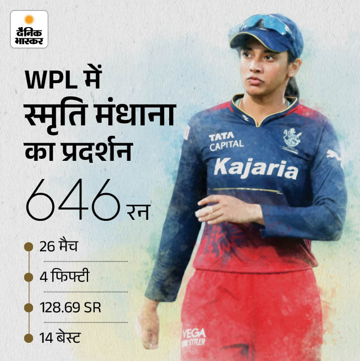 शादी टूटने के बाद मंधाना अब पहली बार किसी टूर्नामेंट में उतरने वाली हैं। वे बेंगलुरु की कप्तानी भी करेंगी। उनके सामने बड़ी प्लेयर्स की कमी पूरी करने की चुनौती तो रहेगी ही, अपने बैटिंग फॉर्म को कायम रखते हुए टीम को प्लेऑफ तक पहुंचाने की चुनौती भी रहेगी। मंधाना WPL के 3 सीजन में 4 ही फिफ्टी लगा सकी हैं।