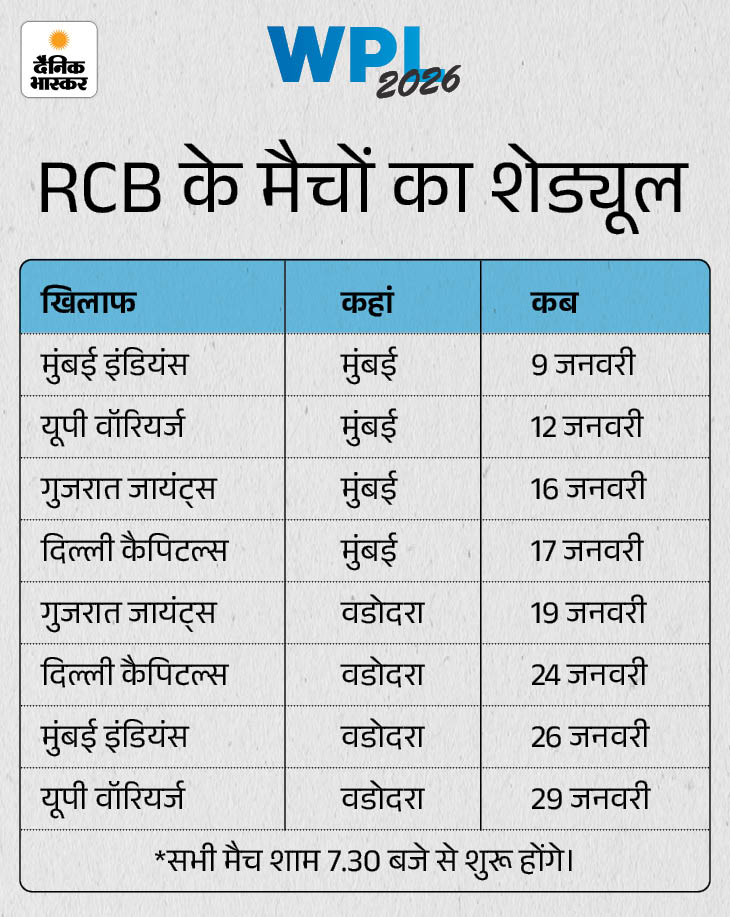 2024 में टाइटल जीतने के बाद RCB से 2025 में भी प्लेऑफ तक पहुंचने की उम्मीदें थीं, लेकिन टीम चौथे स्थान तक ही पहुंच पाई। टीम 8 में से 3 मैच ही जीत पाई। RCB ने गुजरात और दिल्ली को हराकर अपने सीजन की शुरुआत की थी, लेकिन आखिरी 6 में से 5 मैच हारकर टीम प्लेऑफ में जगह भी नहीं बना पाई।