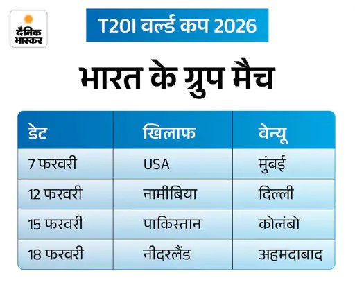 7 फरवरी को USA से भारत का पहला मैच भारत अपने वर्ल्ड कप अभियान की शुरुआत 7 फरवरी को मुंबई में USA के खिलाफ करेगा। उसके बाद 12 फरवरी को नामीबिया से दिल्ली, 15 फरवरी को पाकिस्तान से कोलंबो और 18 फरवरी को नीदरलैंड से अहमदाबाद में खेलेगी। उसके बाद सुपर-8 के मैच होंगे। जिनकी तारीख और वेन्यू ग्रुप स्टेज की रैंक पर निर्भर करेगी।