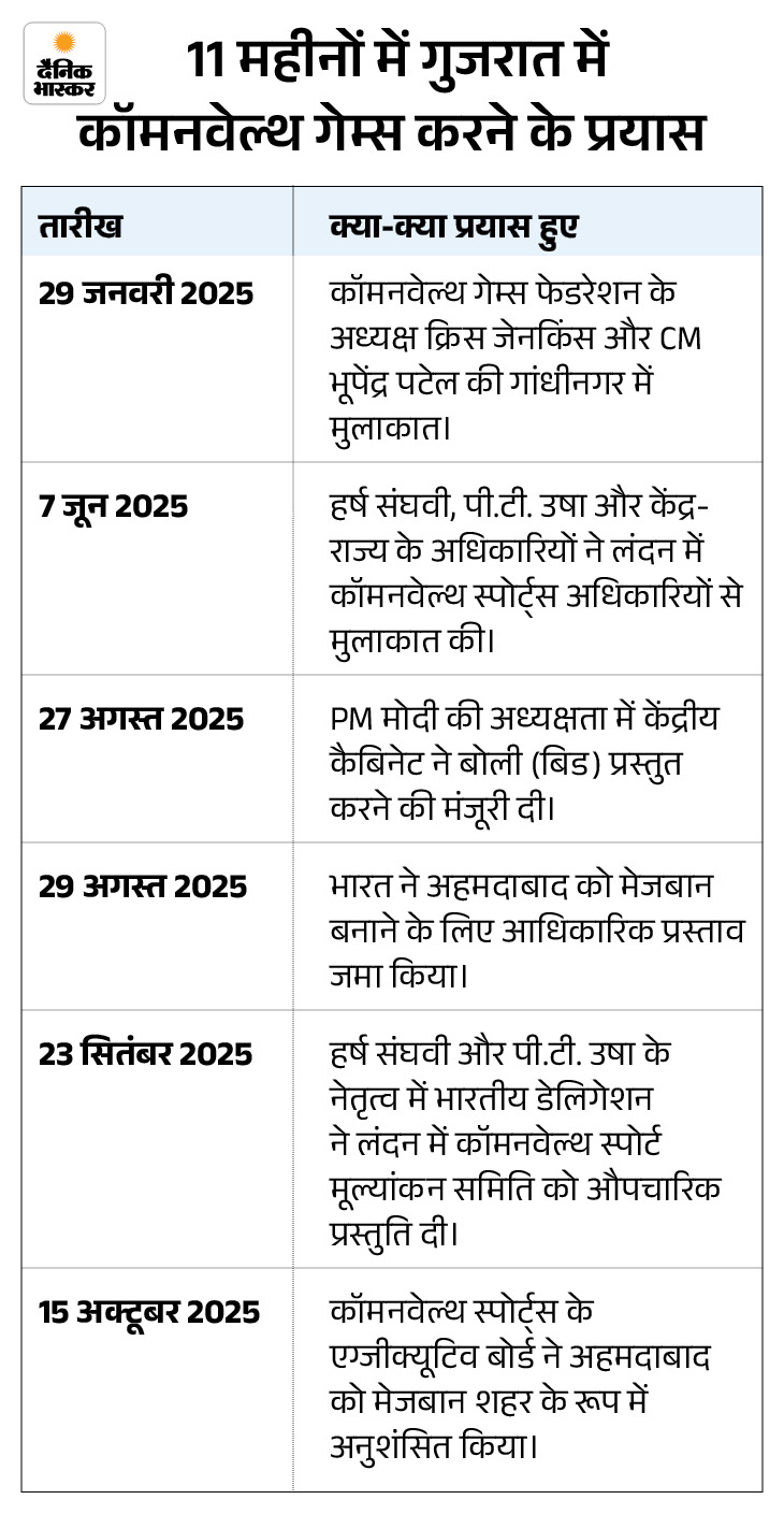 कॉमनवेल्थ की टीम दो बार गुजरात का दौरा कर चुकी कॉमनवेल्थ स्पोर्ट वह संस्था है, जो तय करती है कि आयोजन की मेजबानी किस देश या शहर को मिलेगी। कॉमनवेल्थ टीम दो बार गुजरात का दौरा कर चुकी है, जहां उसने अहमदाबाद के इन्फ्रास्ट्रक्चर और तैयारियों का निरीक्षण किया।