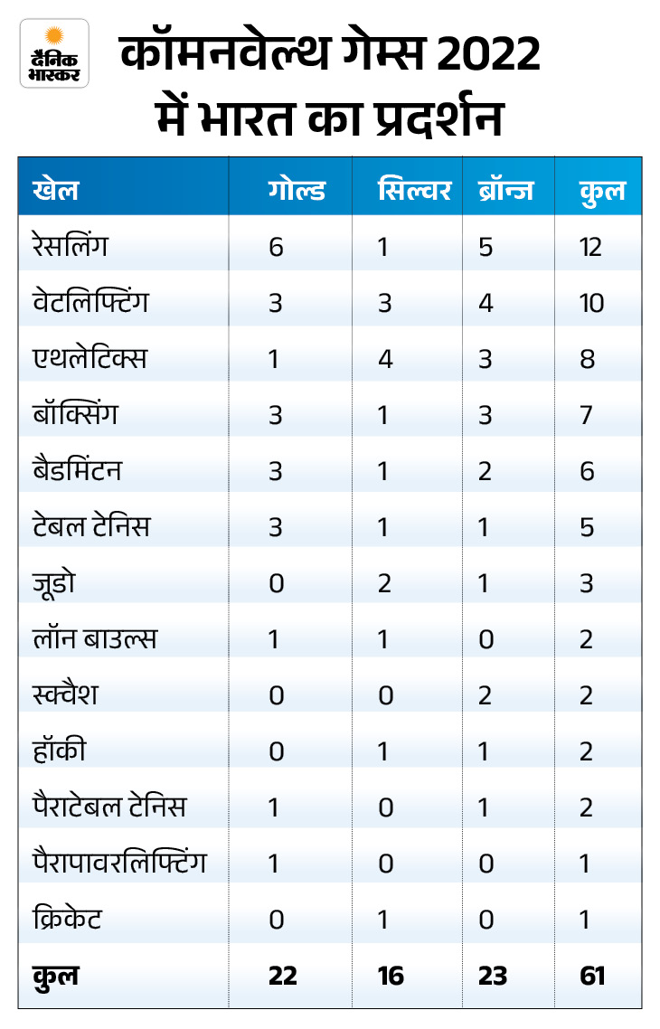 बर्मिंघम कॉमनवेल्थ में 61 मेडल जीते 2022 बर्मिंघम कॉमनवेल्थ गेम्स में 72 देशों के 5000 से अधिक खिलाड़ियों ने भाग लिया था। भारत ने कुल 61 मेडल जीते 22 गोल्ड, 16 सिल्वर और 23 ब्रॉन्ज। इनमें से 30 मेडल सिर्फ कुश्ती, वेटलिफ्टिंग और एथलेटिक्स से आए थे। महिला क्रिकेट टीम ने भी सिल्वर मेडल जीता था।