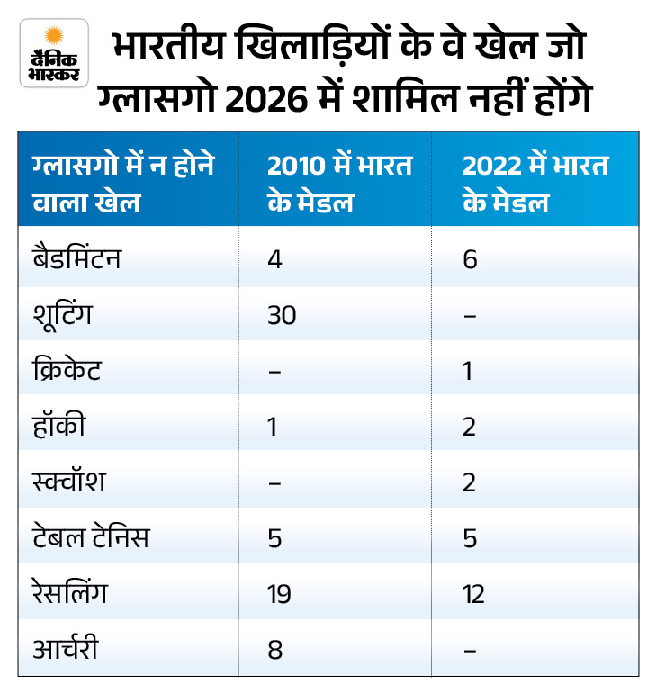 2026 ग्लासगो गेम्स में बजट कारणों से शूटिंग, कुश्ती, हॉकी और टी20 क्रिकेट को हटा दिया गया है, ये वे स्पोर्ट्स हैं जिनमें भारत हमेशा मजबूत रहा है। 2030 में कौन-कौन से खेल शामिल होंगे, यह मेजबान देश तय करेगा। ऐसे में भारत को उम्मीद है कि उसके बेहतर इवेंट शामिल किए जाएंगे।