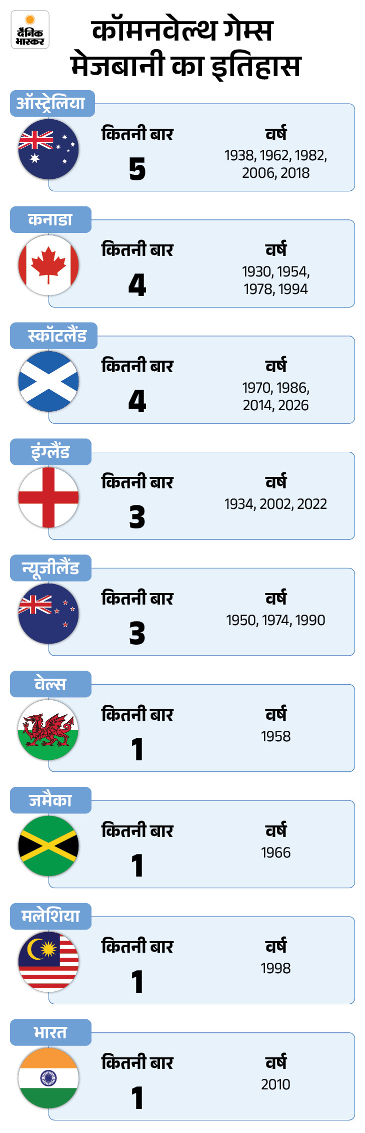 9 देश कॉमनवेल्थ की मेजबानी कर चुके कॉमनवेल्थ गेम्स का आयोजन किसी भी देश के लिए सिर्फ खेल आयोजन नहीं, बल्कि उसकी अंतरराष्ट्रीय छवि, विकास क्षमता, इन्फ्रास्ट्रक्चर और विजन का भी प्रतीक माना जाता है। अब तक ऑस्ट्रेलिया, इंग्लैंड, भारत, कनाडा और न्यूजीलैंड सहित कुल 9 देश इसकी मेजबानी कर चुके हैं। सबसे ज्यादा 5 बार मेजबानी का रिकॉर्ड ऑस्ट्रेलिया के नाम है।