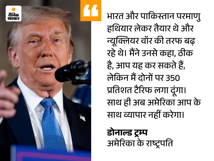 अमेरिकी राष्ट्रपति डोनाल्ड ट्रम्प ने दावा किया है कि उन्होंने 350% टैरिफ लगाने की धमकी देकर भारत-पाकिस्तान के बीच जंग रुकवाई थी।
