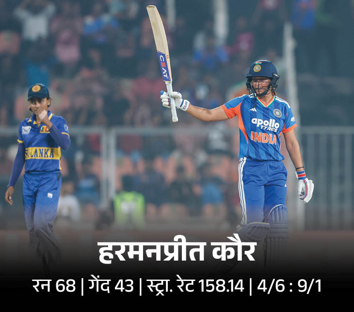 इंडिया विमेंस के लिए कप्तान हरमनप्रीत कौर ने फिफ्टी लगाई। उन्होंने 43 गेंद पर 9 चौके और 1 छक्का लगाकर 68 रन बनाए। अरुंधति रेड्डी ने 27 और अमनजोत कौर ने 21 रन बनाए। श्रीलंका से चमारी अटापट्टू, कविषा दिलहारी और रश्मिका सेवांदी ने 2-2 विकेट लिए।