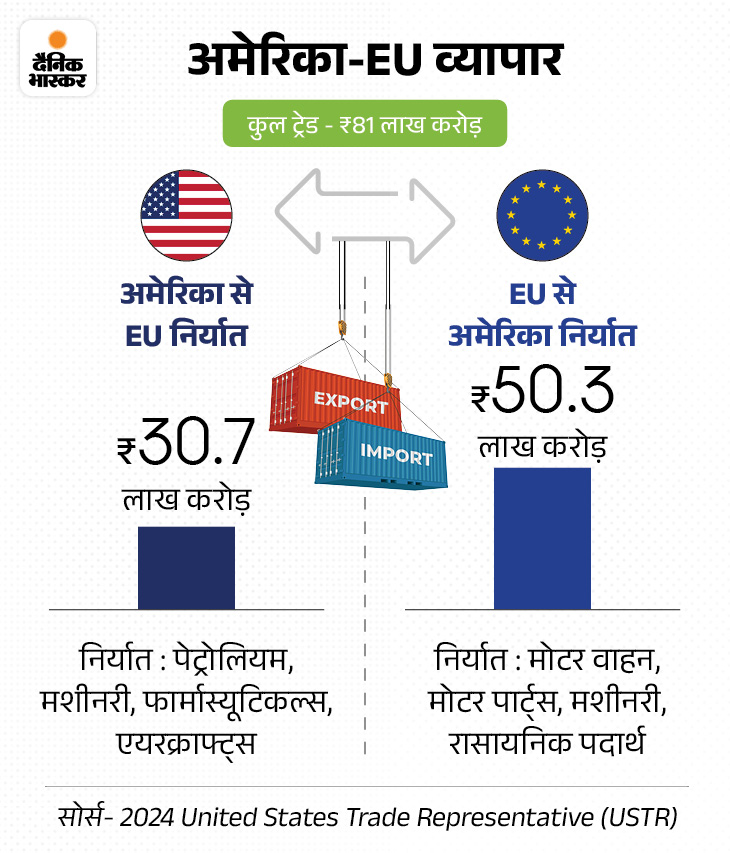 EU अगले 3 साल में अमेरिका से 750 बिलियन डॉलर, यानी करीब 64 लाख करोड़ रुपए की एनर्जी खरीदेगा। इसके साथ ही EU अमेरिका में 600 बिलियन डॉलर यानी 51 लाख करोड़ रुपए का निवेश करेगा। ये निवेश अमेरिका के फार्मा, ऑटो और डिफेंस सेक्टर में होगा।
