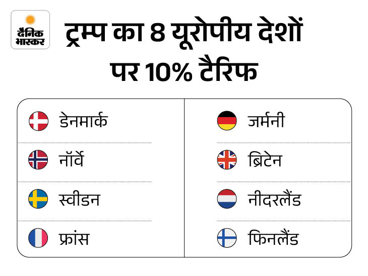 अमेरिकी राष्ट्रपति डोनाल्ड ट्रम्प ने यूरोप के 8 देशों पर 10% टैरिफ लगा दिया है। ये देश ग्रीनलैंड पर अमेरिका के कब्जे की धमकी का विरोध कर रहे थे।