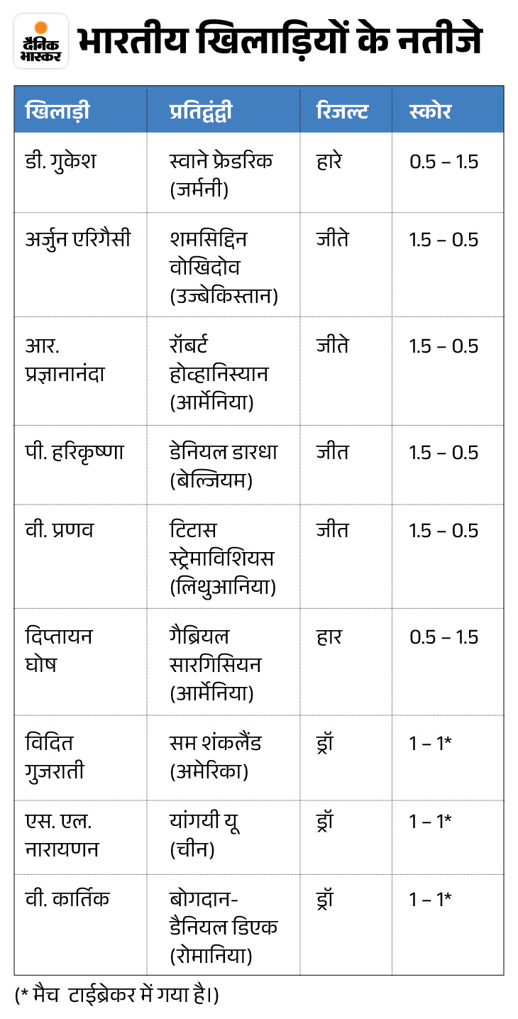 एरिगैसी और प्रज्ञानानंदा भी राउंड-32 में पहुंचे भारत के दो और शीर्ष खिलाड़ी अर्जुन एरिगैसी और आर. प्रज्ञानानंदा भी राउंड-ऑफ-32 में पहुंचे। अर्जुन ने उज्बेकिस्तान के शमसिद्दिन वोखिदोव को हराया, जबकि प्रज्ञानानंदा ने आर्मेनिया के रॉबर्ट होव्हानिस्यान को मात दी। अर्जुन को अगले दौर में पहुंचने के लिए ड्रॉ काफी था, जबकि प्रज्ञानानंदा ने शानदार जीत दर्ज की।