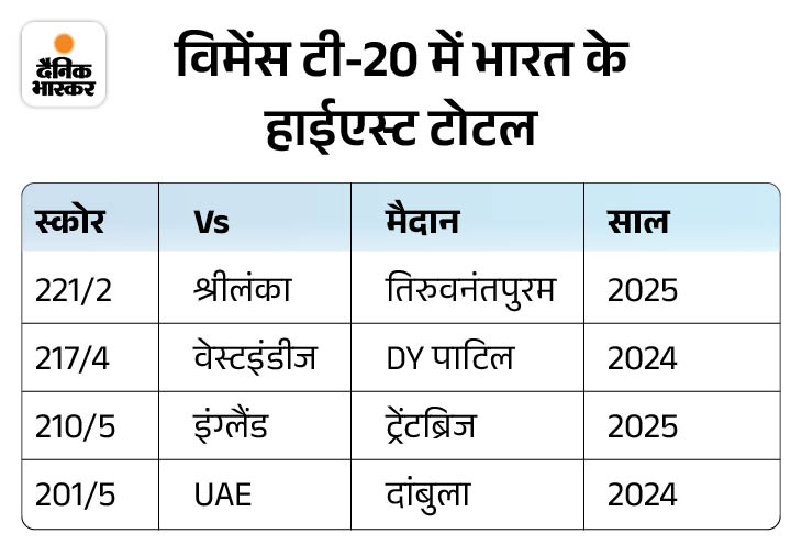 1. भारतीय विमेंस का टी-20 में हाईएस्ट टोटल विमेंस टी-20 इंटरनेशनल में भारत ने अपने इतिहास का सबसे बड़ा स्कोर चौथे टी-20 में बनाया। टीम ने तिरुवनंतपुरम में श्रीलंका के खिलाफ 221/2 रन बना डाले। इससे पहले भारत ने 2024 में DY पाटिल स्टेडियम में वेस्टइंडीज के खिलाफ 217/4 का स्कोर बनाया था।