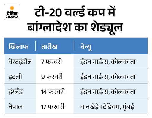 ग्रुप-सी में है बांग्लादेश टी-20 वर्ल्ड कप में बांग्लादेश को ग्रुप-सी में रखा गया है। टीम 7 फरवरी को वेस्टइंडीज, 9 फरवरी को इटली और 14 फरवरी को इंग्लैंड से भिड़ने वाली हैं। तीनों मैच कोलकाता के ईडन गार्डन्स स्टेडियम में खेले जाने हैं। वहीं टीम का आखिरी ग्रुप स्टेज मैच 17 फरवरी को मुंबई में नेपाल से होना है।