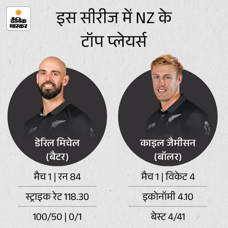 जैमीसन ने पिछले मैच में 4 विकेट लिए डेरिल मिचेल ने इस सीरीज के पहले मैच में न्यूजीलैंड के लिए सबसे ज्यादा 84 रन बनाए थे। हालांकि, टीम को जीत दिलाने में सफल नहीं हो सके। वहीं, काइल जैमीसन ने गेंदबाजी में 4 विकेट लिए। जैमीसन सीरीज के टॉप विकेट टेकर हैं।