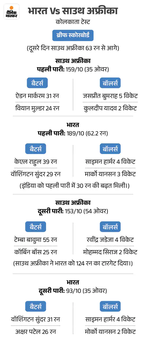 पहले टेस्ट में भारत हारा, मैच ढाई दिन में ही खत्म पहला टेस्ट ईडन गार्डन्स में खेला गया था, जो ढाई दिन में ही खत्म हो गया। भारत को इस मैच में 30 रन से हार झेलनी पड़ी। 14 नवंबर से शुरू हुआ मुकाबला 16 नवंबर की दोपहर में ही समाप्त हो गया, जबकि इसे 18 नवंबर तक खेला जाना था। साउथ अफ्रीका ने पहली पारी में 159 और दूसरी पारी में 153 रन बनाए। जवाब में भारत ने पहली पारी में 189 रन और दूसरी पारी में केवल 93 रन बनाए। रेड्‌डी ने साउथ ए के खिलाफ पहले मुकाबले में 37 रन बनाए थे राजकोट में पहले भारत-ए मैच में रेड्डी ने 37 रन बनाए और गेंदबाजी में 1/18 का स्पैल डाला। दूसरे मैच में उन्हें बल्लेबाजी और गेंदबाजी दोनों में मौका नहीं मिला। अब स्क्वाड में वापसी के कारण वे 19 नवंबर को होने वाला तीसरा भारत-ए मैच नहीं खेल पाएंगे।