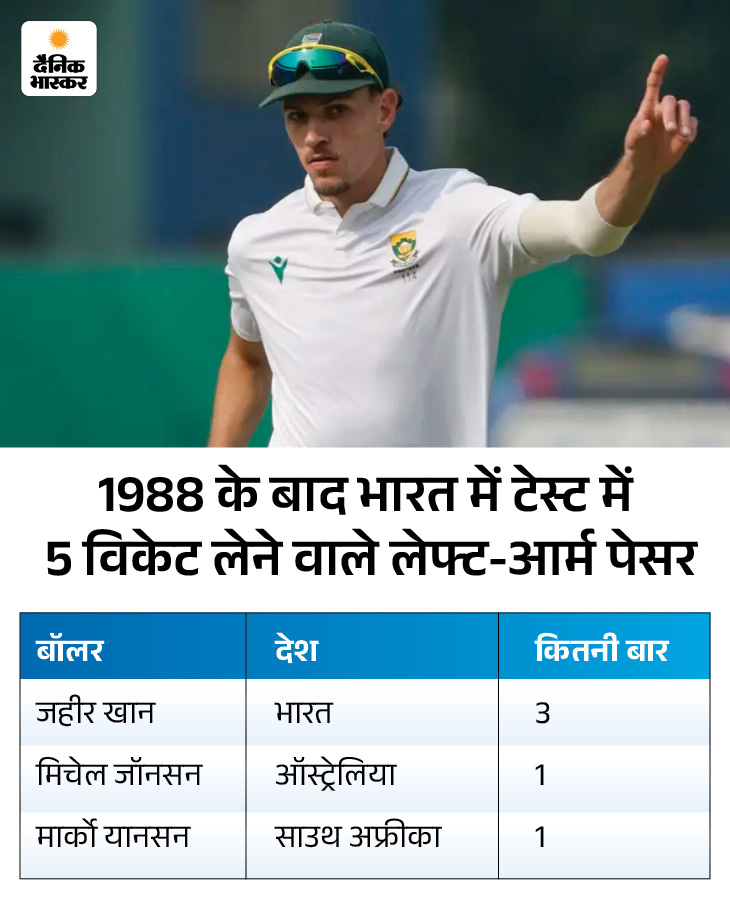यानसन 1988 के बाद भारत में 5 विकेट लेने वाले तीसरे लेफ्ट आर्म पेसर मार्को यानसन 1988 के बाद भारत में टेस्ट मैच में 5 विकेट लेने वाले तीसरे लेफ्ट-आर्म पेसर बन गए हैं। उनसे पहले यह उपलब्धि केवल जहीर खान और मिचेल जॉनसन ने हासिल की थी। जहीर ने भारत में तीन बार 5 विकेट लिए, जबकि मिचेल जॉनसन ने यह कारनामा 2010 के मोहाली टेस्ट में किया था।