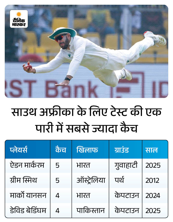 मार्कराम से पहले मार्को यानसन ने 2024 में भारत के खिलाफ केपटाउन टेस्ट में 4 कैच पकड़े थे, जबकि इसी साल डेविड बेडिंघम ने पाकिस्तान के खिलाफ केपटाउन में 4 कैच लिए थे।