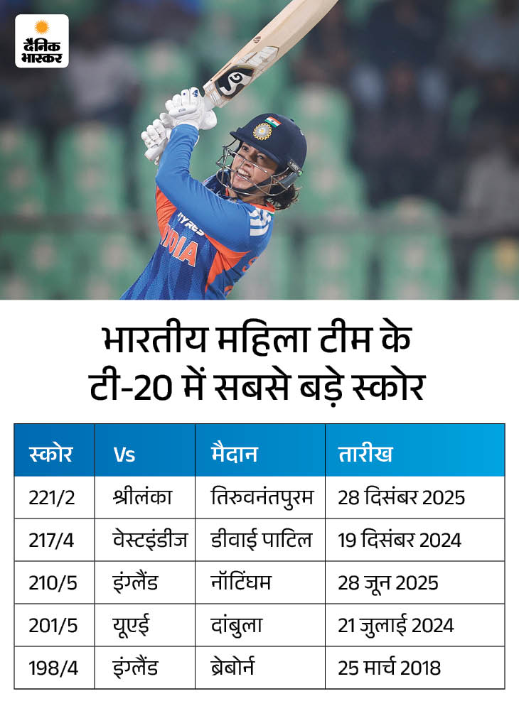 इंडिया विमेंस ने टी-20 क्रिकेट में अपना सबसे बड़ा स्कोर बना दिया। रविवार को चौथे टी-20 में भारत ने श्रीलंका को 222 रन का टारगेट दिया। इससे पहले भारत का बेस्ट स्कोर 217 रन था, टीम ने 2024 में वेस्टइंडीज के खिलाफ यह स्कोर बनाया था।