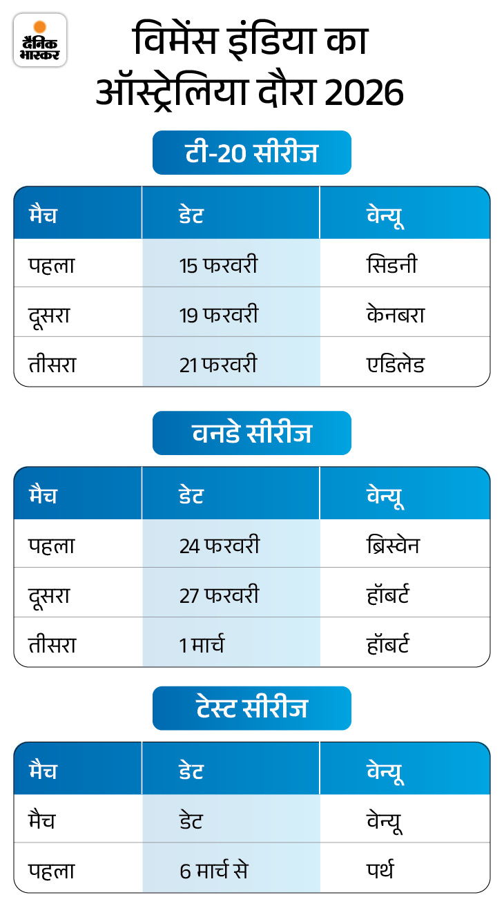 इन तीनों को पहली बार टेस्ट टीम में जगह मिली है। यह मुकाबला 6 से 9 मार्च तक पर्थ में खेला जाएगा। टीम की कप्तानी हरमनप्रीत कौर करेंगी। यह टेस्ट मैच ऑस्ट्रेलिया दौरे के व्हाइट बॉल मुकाबलों के बाद खेला जाएगा। भारत और ऑस्ट्रेलिया के बीच पहले 3 T20I और 3 वनडे मैच खेले जाएंगे, जिनकी शुरुआत 15 फरवरी से होगी।