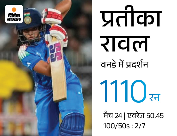 वनडे प्रदर्शन के दम पर प्रतीका को मौका प्रतीका रावल का टेस्ट टीम में चयन उनके हालिया वनडे प्रदर्शन को देखते हुए लगभग तय माना जा रहा था। उन्होंने 24 वनडे मैचों में 50.45 की औसत से 1110 रन बनाए हैं। इस दौरान उनके नाम 2 शतक और 7 अर्धशतक दर्ज हैं।