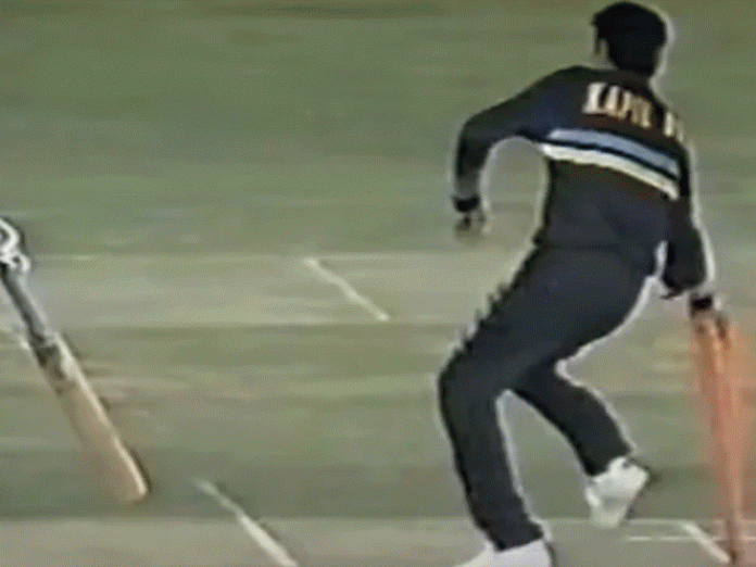 पीटर कर्स्टन को रनआउट करते पूर्व भारतीय कप्तान कपिल देव।
