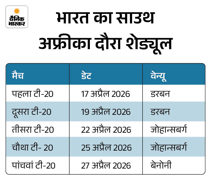 भारतीय टीम इस दौरे पर कुल 5 टी-20 मैच खेलेगी। सीरीज का आगाज 17 अप्रैल को डरबन में होगा। पहले दो मुकाबले इसी शहर में खेले जाएंगे। इसके बाद तीसरा और चौथा टी-20 जोहान्सबर्ग के मैदान पर होगा। सीरीज का पांचवां और आखिरी मैच 27 अप्रैल को बेनोनी में खेला जाएगा। दक्षिण अफ्रीका की उछाल भरी पिचों पर भारतीय बल्लेबाजों की कड़ी परीक्षा होने की उम्मीद है।