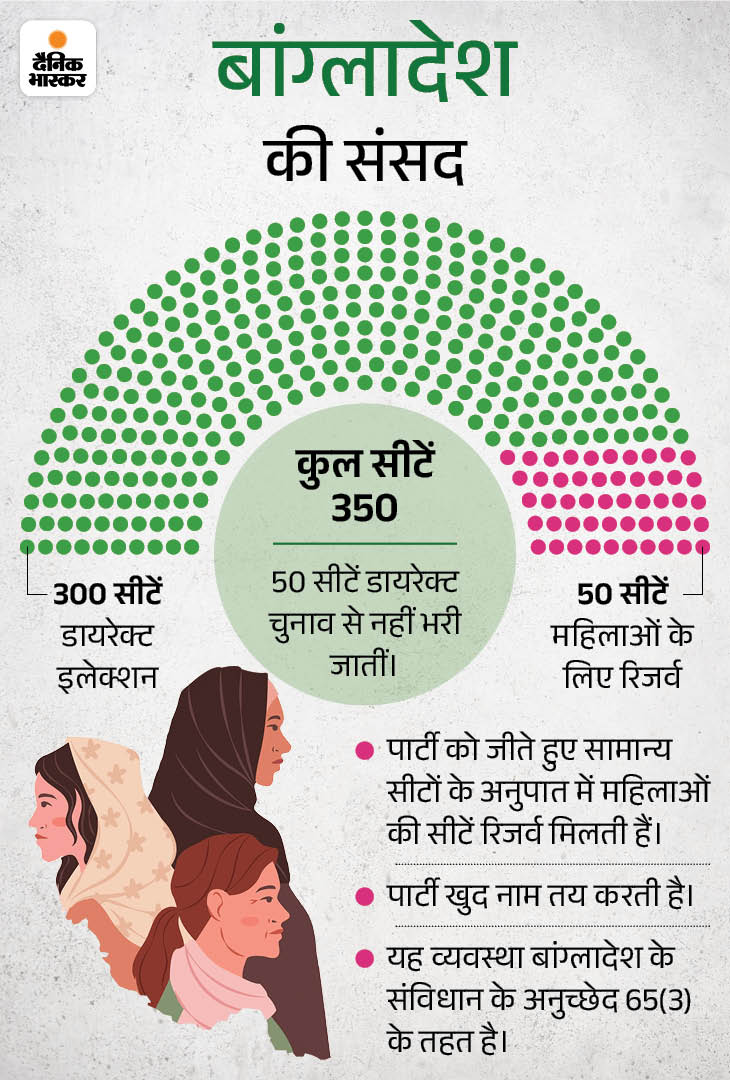 यहां की संसद में कुल 350 सीटें हैं। इनमें से 50 सीटें महिलाओं के लिए आरक्षित हैं। आरक्षित सीटों पर चुनाव नहीं होता, जबकि 300 सीटों के लिए हर पांच साल में आम चुनाव होते हैं। भारत की संसद में लोकसभा के अलावा राज्यसभा भी होती है, लेकिन बांग्लादेश की संसद में सिर्फ एक ही सदन है।