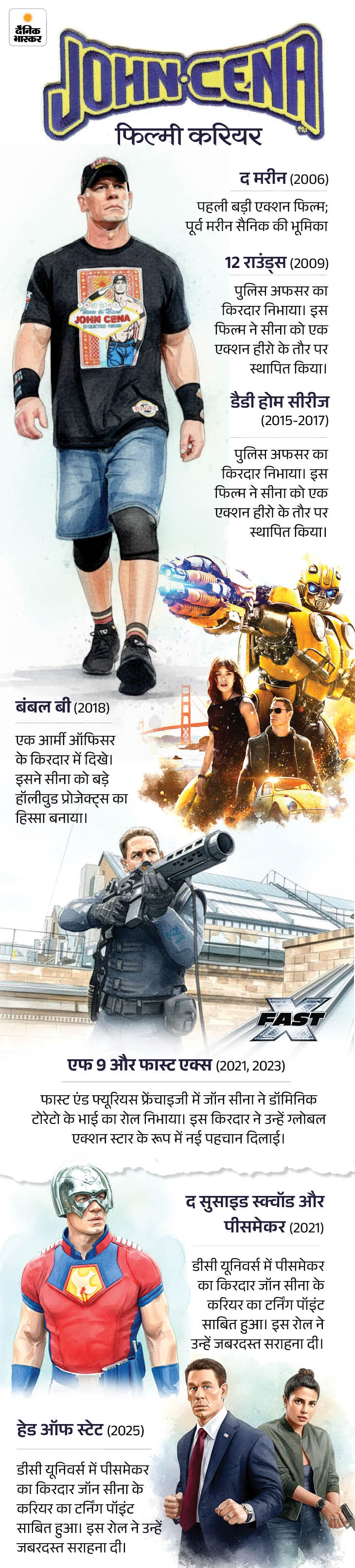 हॉलीवुड फिल्में की, सफल भी हुए जॉन सीना ने रेसलिंग के साथ-साथ एक्टिंग भी की। उन्होंने कई हॉलीवुड फिल्मों में काम किया। उन्हें फैंस ने खूब पसंद किया। संन्यास के बाद एक बार फिर उनकी फिल्मों पर चर्चा तेज हो गई है।