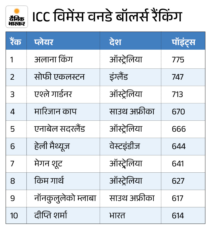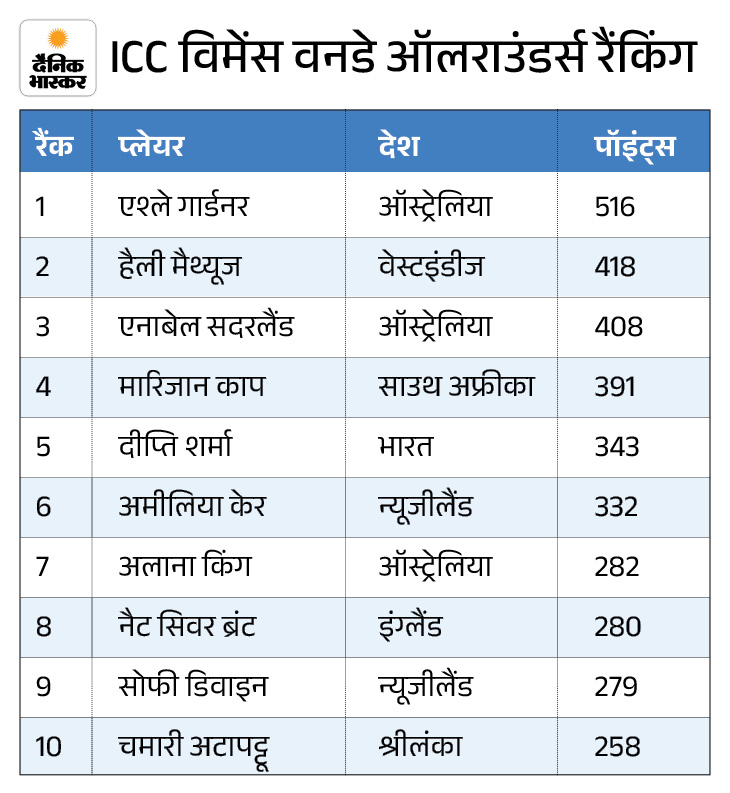 ऑलराउंडर्स में दीप्ति शर्मा टॉप-5 में बरकरार भारतीय ऑलराउंडर दीप्ति शर्मा ने गेंदबाजों और ऑलराउंडर्स दोनों श्रेणियों में टॉप-10 में अपनी जगह बनाए रखी है। वह गेंदबाजी रैंकिंग में 10वें स्थान पर हैं, जबकि ऑलराउंडर्स की सूची में वह पांचवें पायदान पर काबिज हैं। ऑलराउंडर्स रैंकिंग में ऑस्ट्रेलिया की एशले गार्डनर 516 पॉइंट्स के साथ पहले स्थान पर हैं, जो दूसरे स्थान पर मौजूद वेस्टइंडीज की हेले मैथ्यूज (418) से लगभग 100 पॉइंट्स आगे हैं।