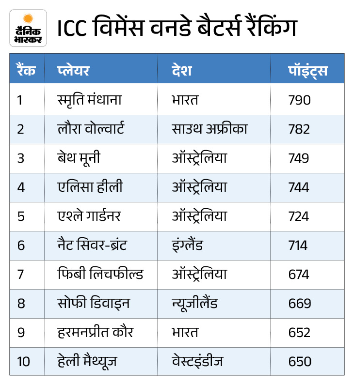 मंधाना की रेटिंग पॉइंट्स 790 हो गई है, जबकि लौरा वोल्वार्ट का रेटिंग पॉइंट्स 782 है। ऑस्ट्रेलिया के खिलाफ सीरीज में मंधाना ने 58 और 31 रनों की महत्वपूर्ण पारियां खेली थीं। हालांकि, वोल्वार्ड्ट के पास मार्च और अप्रैल में न्यूजीलैंड के खिलाफ होने वाली सीरीज में दोबारा नंबर-1 बनने का मौका होगा।