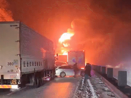 टक्कर के बाद एक्सप्रेसवे का एक हिस्सा ब्लॉक हो गया। पीछे से आ रही गाड़ियां बर्फीली सड़क पर समय रहते ब्रेक नहीं लगा सकीं और देखते ही देखते 50 से ज्यादा गाड़ियां आपस में भिड़ गए। टक्कर के बाद गाड़ियों में आग लग गई।