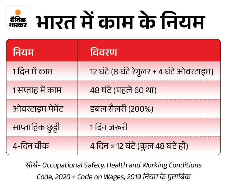 WHO-ILO के एक अध्ययन में भारत को ज्यादा काम से होने वाली मौतों के लिए सबसे ज्यादा प्रभावित देशों में बताया गया है। भारतीय मजदूर अक्सर बिना ओवरटाइम पेमेंट के 10-11 घंटे काम करते हैं।
