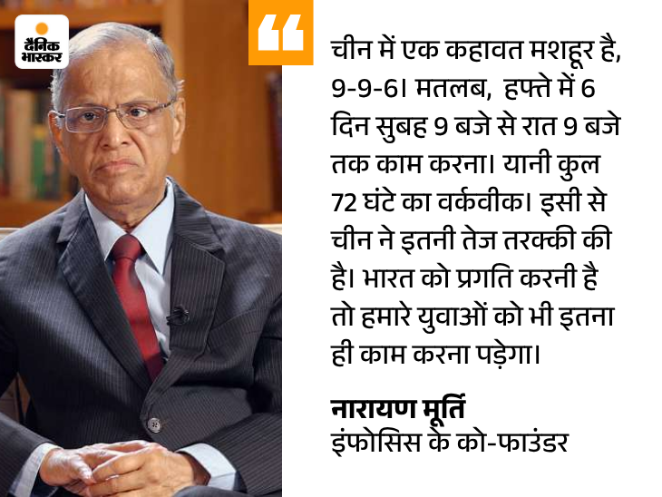मूर्ति ने कहा कि, ‘अगर भारत को चीन की तरह तेजी से आगे बढ़ना है तो युवाओं को हफ्ते में कम-से-कम 72 घंटे काम करना होगा।’ उन्होंने कहा कि देश के हर नागरिक, ब्यूरोक्रेट और कॉर्पोरेट लीडर को इसके लिए मेहनत करनी होगी।