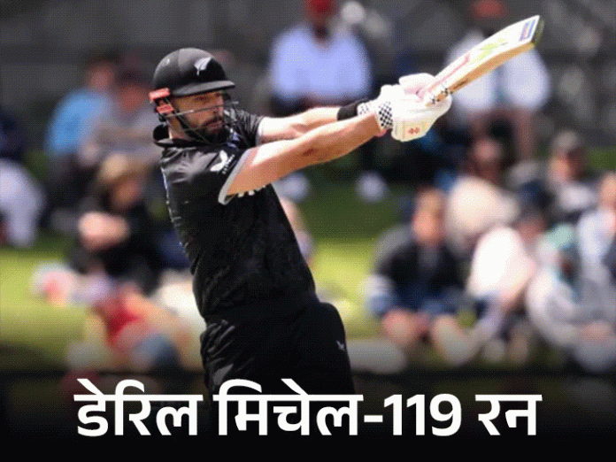 मिचेल का शतक डेरिल मिचेल ने 118 गेंदों का सामना कर 119 रन की पारी खेली और टीम को सम्मानजनक स्कोर तक पहुंचाया।