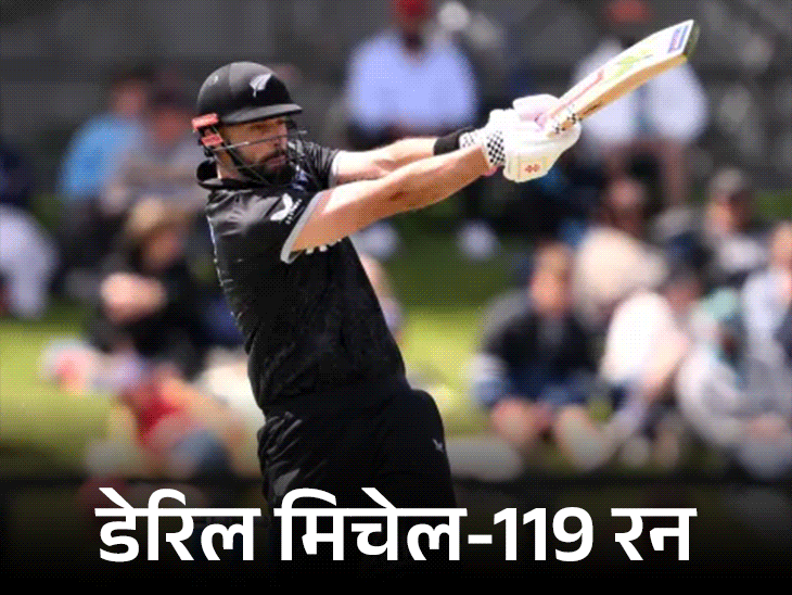 New Zealand Vs West Indies 1st ODI Update; Matthew Forde | Rachin Ravindra | न्यूजीलैंड ने पहले वनडे में वेस्टइंडीज को 7 रन हराया: डेरिल मिचेल ने 119 रनों की शतकीय पारी खेली, जैमिसन ने 4 विकेट लिए