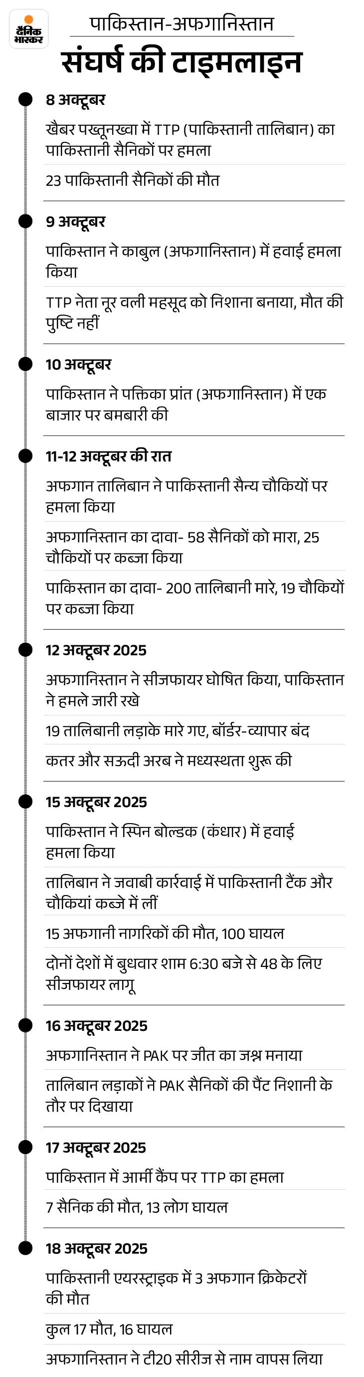 स्थानीय मीडिया रिपोर्ट्स के मुताबिक, ये हमले उर्गुन और बर्मल जिलों के रिहायशी इलाकों में हुए। इससे पहले दोनों देशों के बीच 15 अक्टूबर, बुधवार को 48 घंटे का सीजफायर हुआ था, जो शुक्रवार शाम 6 बजे खत्म हुआ। इसे आगे बढ़ाने पर सहमति बन गई थी। लेकिन कुछ ही घंटे बाद पाकिस्तान ने हमला कर दिया।